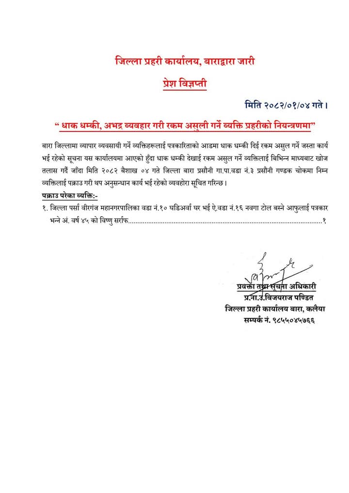 व्यापारीहरूलाई पत्रकार हुँ भन्दै धम्की दिई रकम असुल्ने गरेको आरोपमा वीरगञ्ज महानगरपालिका–१० घडिअर्वा घर भई हाल वीरगञ्ज–१६ नवगा टोल बस्ने ४५ वर्षीय विष्णु सर्राफलाई पक्राउ गरिएको बारा प्रहरीले जनाएको छ।